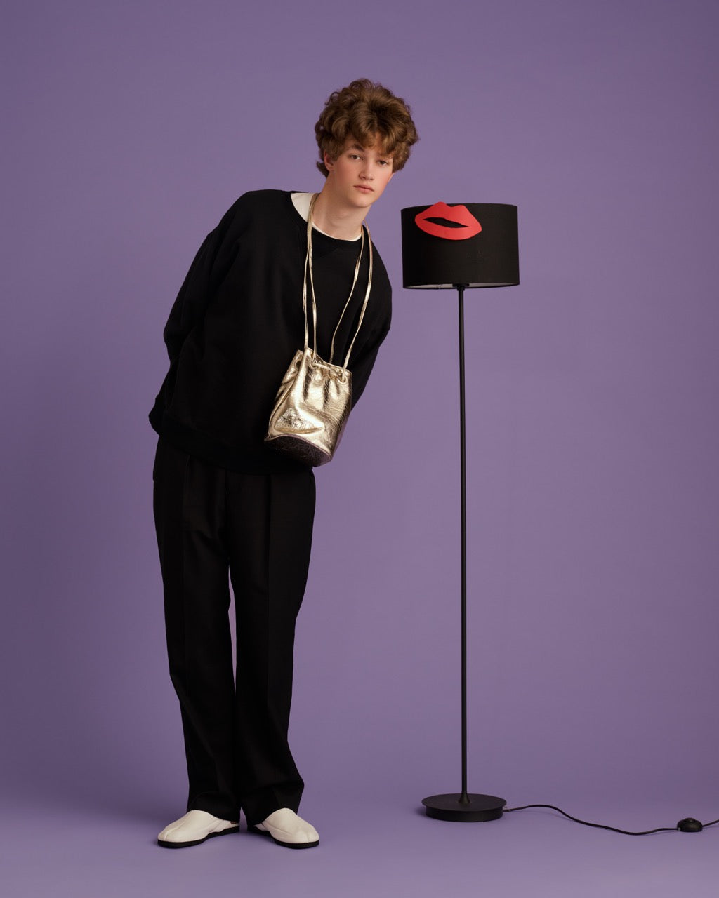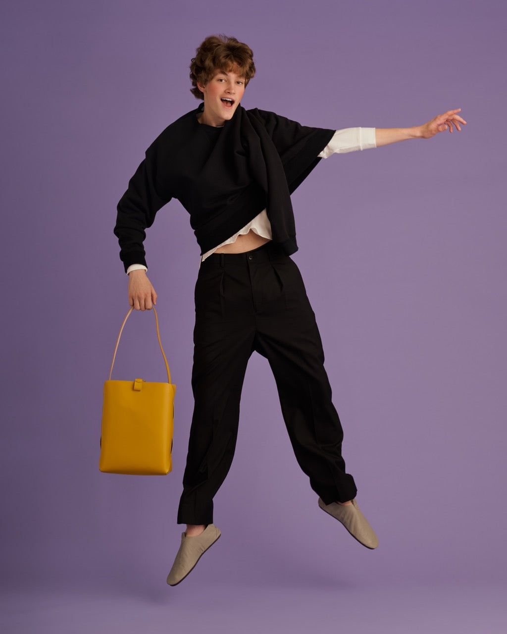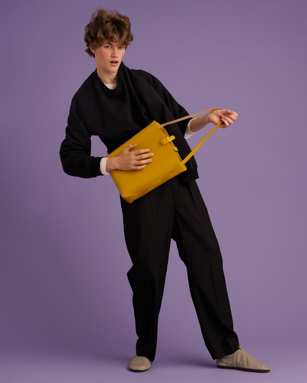 シンプルでミニマムなコーディネートには、ゴールドのバッグや少し派手な小物をプラス。レザーアイテムでモノクロコーデも一気に主役に。