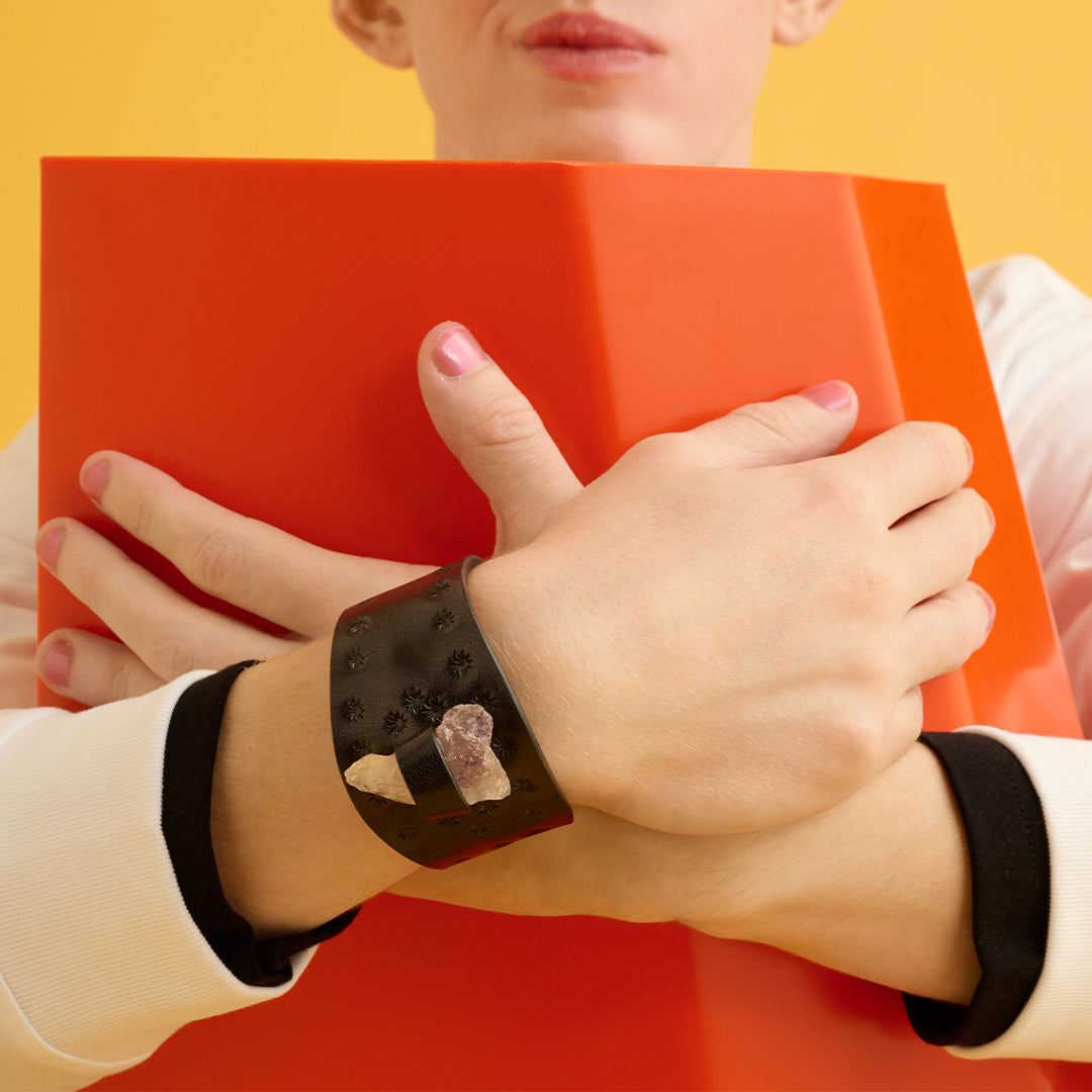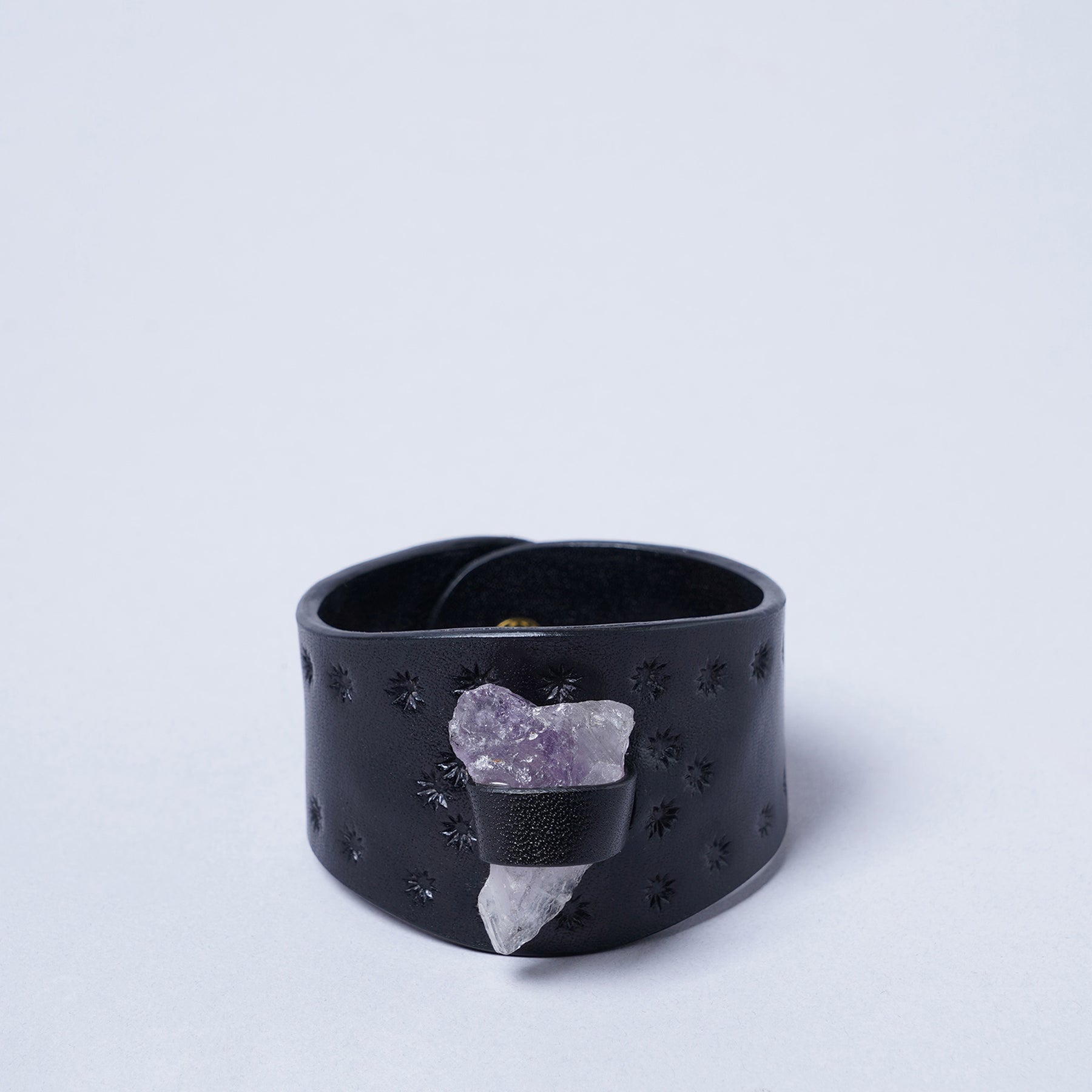 Like the Mass I, this bangle is decorated with stones and patterns on a large belt, expressing preciousness, solemnity, and holiness. This bangle is carefully crafted using high quality Japanese cowhide tanned with vegetable tannin, which does not use chemicals. The natural stone used is amethyst. *Because amethyst is a natural material, there are individual differences.