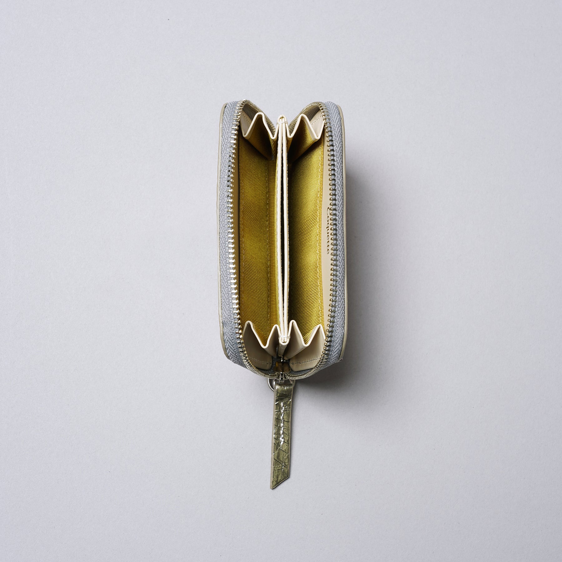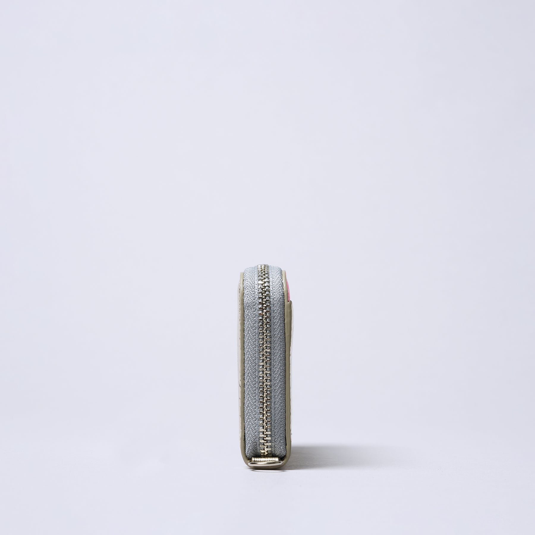 A compact wallet small enough to use as a coin purse or card case. Bills fit when folded in three. Inside, it holds up to five credit cards stacked together, plus two cards in each side pocket. The interior alone holds about 14 cards. The center pocket can also hold coins. The exterior back pocket holds credit cards and transportation IC cards, allowing them to function properly.