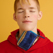 Available in two colors: Gold and Blue. Gold is a champagne-like color, somewhere between gold and silver. The outer pocket features a pink accent in the same material. Blue uses gold as its accent color.