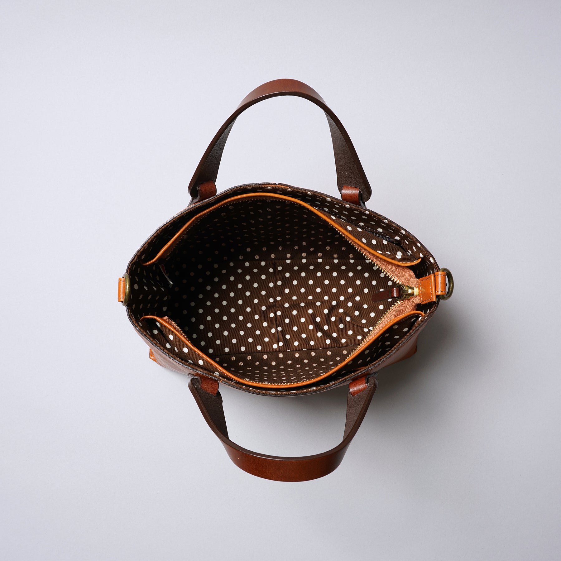 This long-selling series features expressive cowhide with a subtle grain pattern, accented with vegetable-tanned leather components. The polka dot lining visible through the top opening is another signature detail. The shoulder strap, crafted from the same leather, is detachable. Crafted from material that ages beautifully, it develops a softer, more attractive patina the more it's used.
