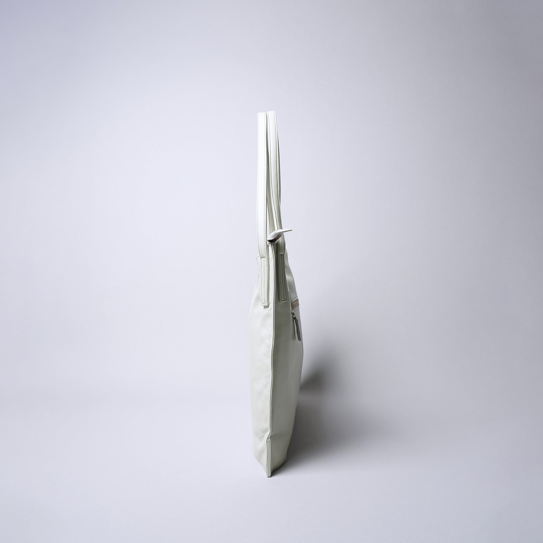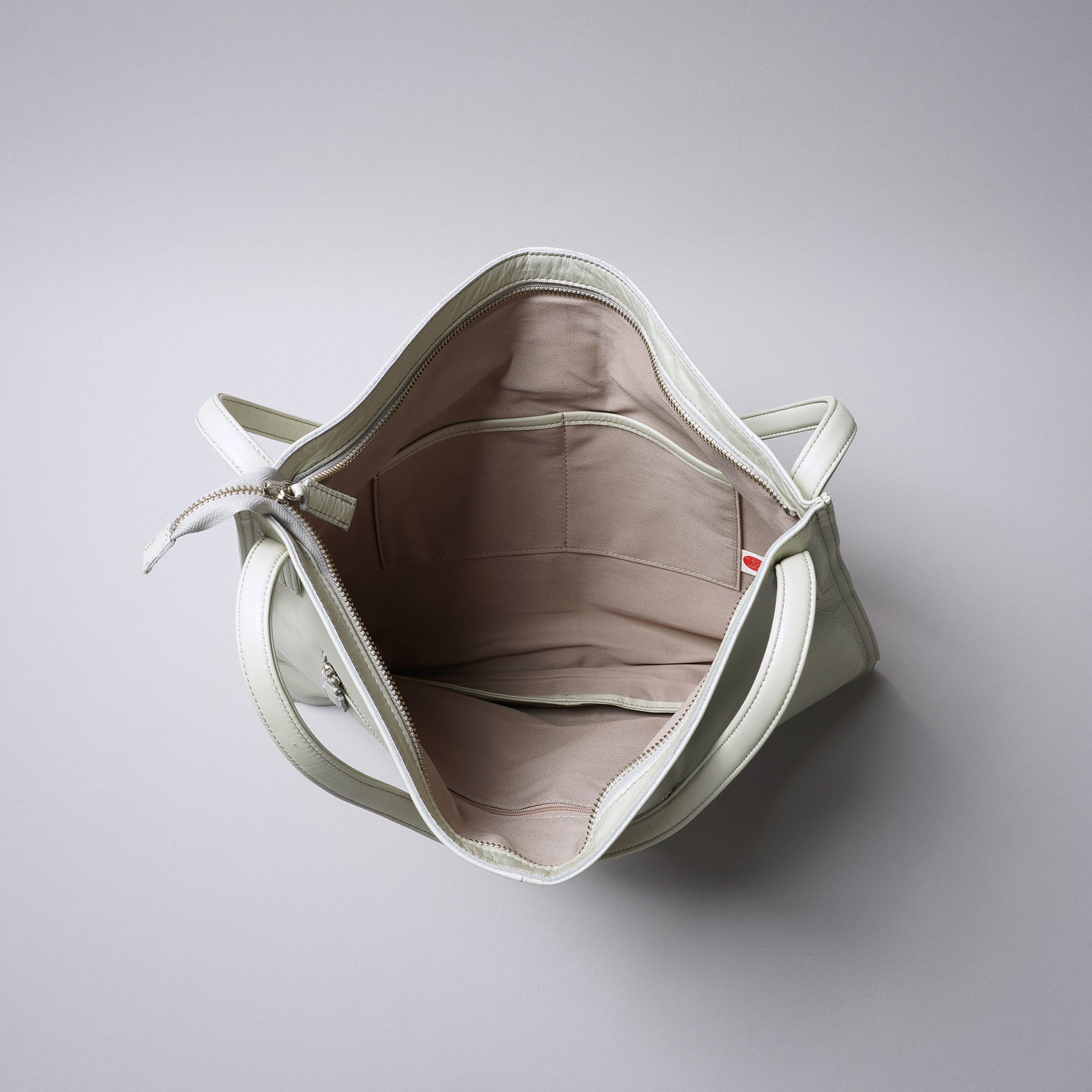 手触りの良いソフト牛革を使い直線的なラインを意識し、持った時にスマートさを感じられるようにデザインされています。中に荷物を入れるとマチが膨らむ仕様になっており、表情の変化も楽しめます。