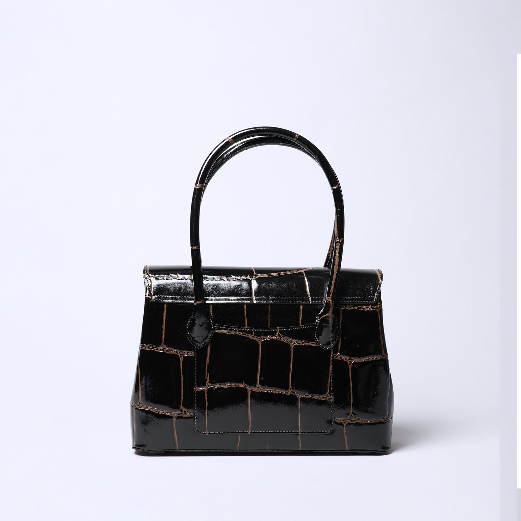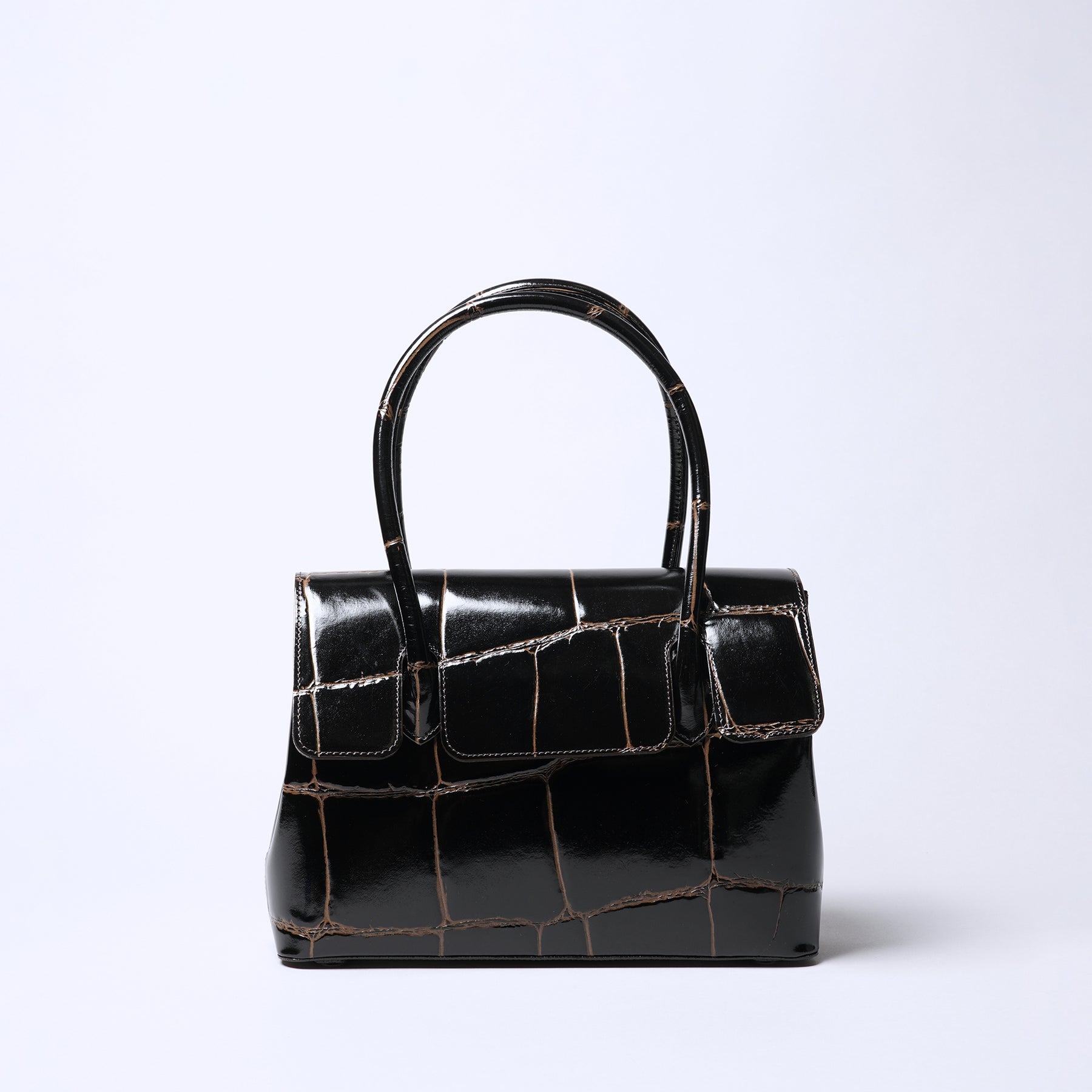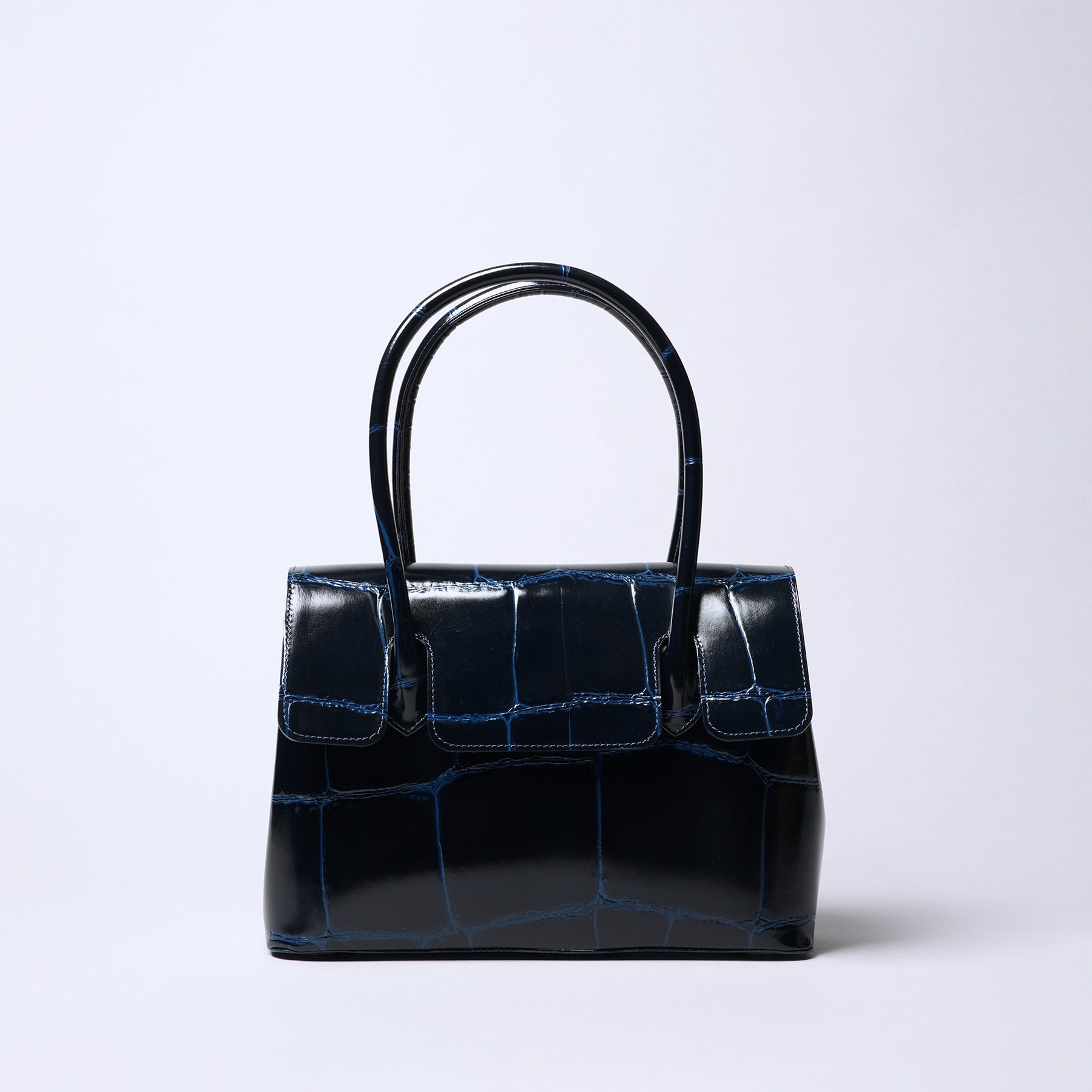 全体にラージクロコの型押し牛革を贅沢に使用したシリーズのハンドバッグです。一見かっちりした印象ですが、カジュアルな装いにも合わせられ気軽に持てるバッグです。