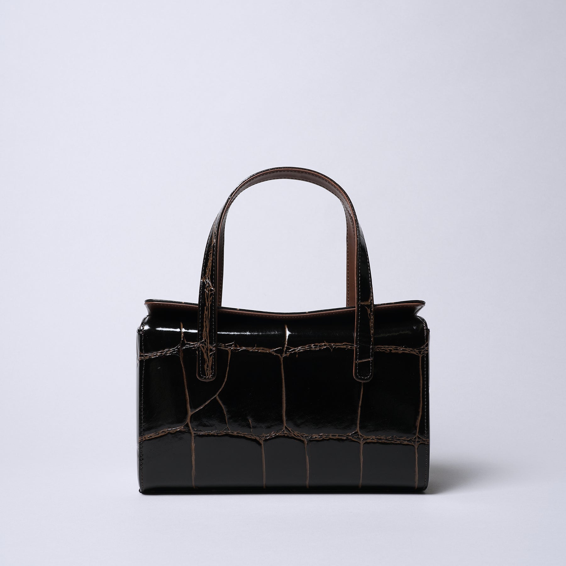 全体にラージクロコの型押し牛革を贅沢に使用したシリーズのハンドバッグです。一見かっちりした印象ですが、カジュアルな装いにも合わせられ気軽に持てるバッグです。