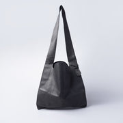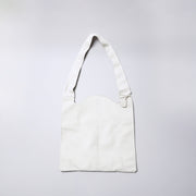 暮らしに馴染み深いプロダクトであるレジ袋をモチーフに、ワンショルダータイプにデザインされた「レジブクロ ショルダーL」。A4サイズを入れてもかなり余裕のある大容量。存在感のある大きさなので、装いの一部としてコーディネートするのも楽しいバッグです。男性にも好まれるサイズですが、女性が掛けて持ったときのバランスも、また素敵。丈夫なハリーの生地を使っているため、重い本やPCを入れて、通勤・通学にもおあつらえ。また、全体の印象を引き締める中央のステッチラインは、さりげなく補強の役割も果たします。ショルダーストラップは幅広で、掛けて持ったときのからだへの負担を軽減します。女性が斜め掛けしたときに、からだにちょうどよく添う長さです。