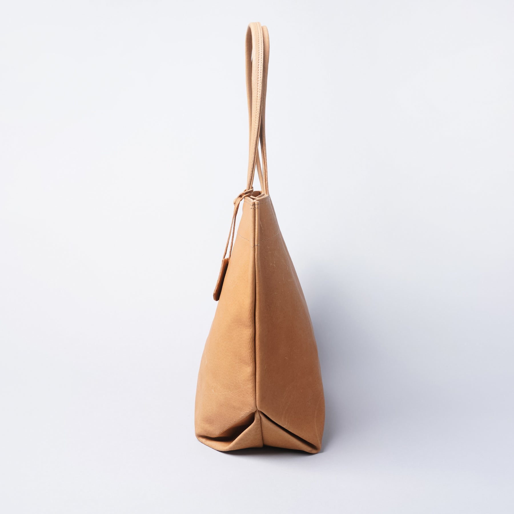 ピッグスキンならではのナチュラルで柔らかな雰囲気が好印象で、革本来の風合いを存分に楽しめるトートバッグ。気負わずラフに使って、多少の傷や汚れや水シミなんかも気にする事なく、それらも全部ひっくるめた経年変化を楽しみたい。