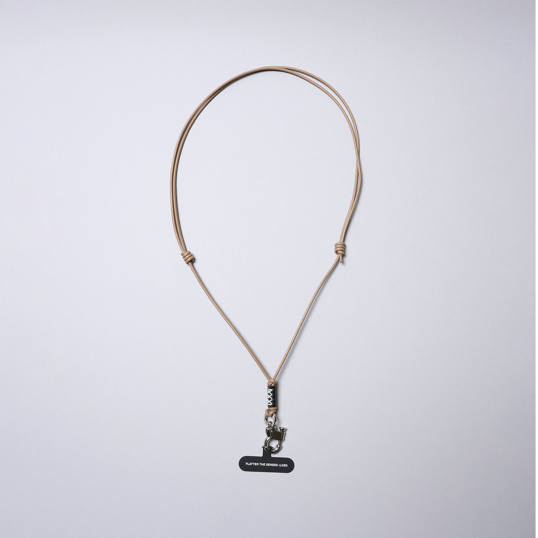 しなやかなレザーコードを使用、結び目をスライドさせることで長さ調整可(80cm~最長150cm程度/斜め掛け可能)