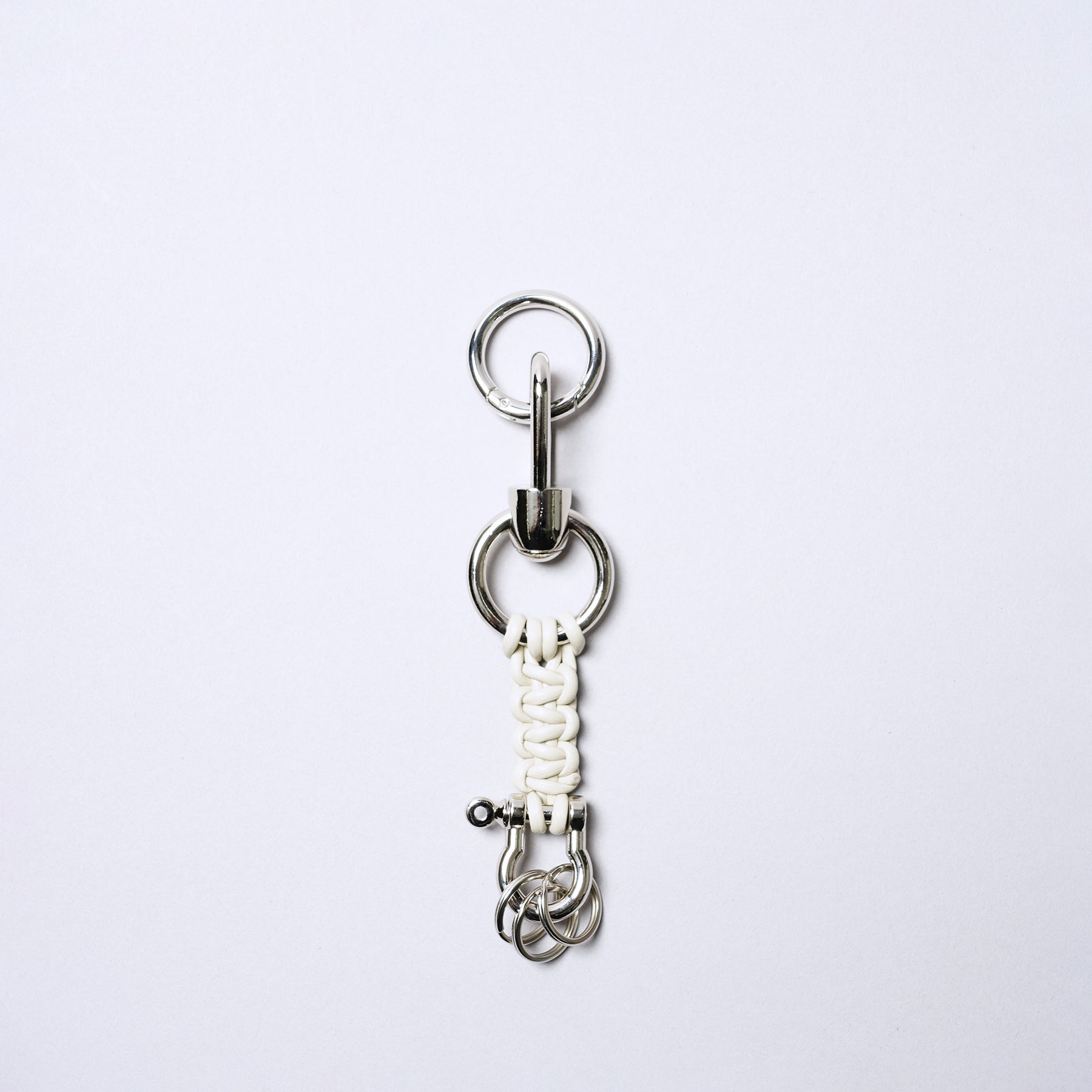 這款鑰匙圈結合了皮革編織繩、登山扣環及螺絲式D型扣環設計