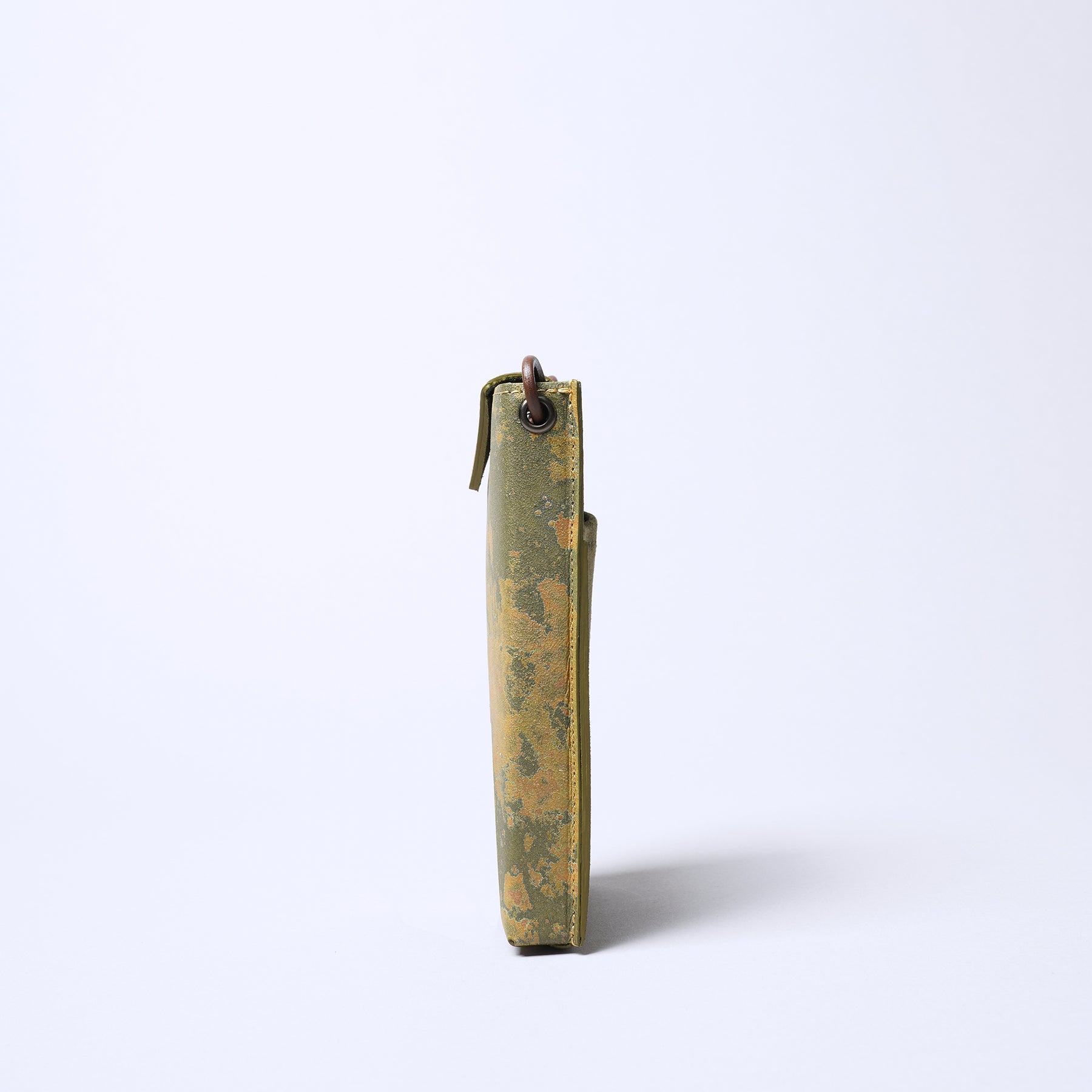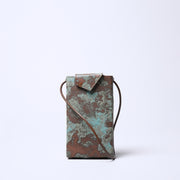 這款7.5英吋薄型皮革手機收納套是採用黃銅鏽加工處理之皮革製成。此種材質乃由皮革職人依據積累經驗及其藝術感將一片片皮革噴塗黃銅或紅銅,使之產生鏽化效果,進而精心製作成具有工藝品等級的皮革。