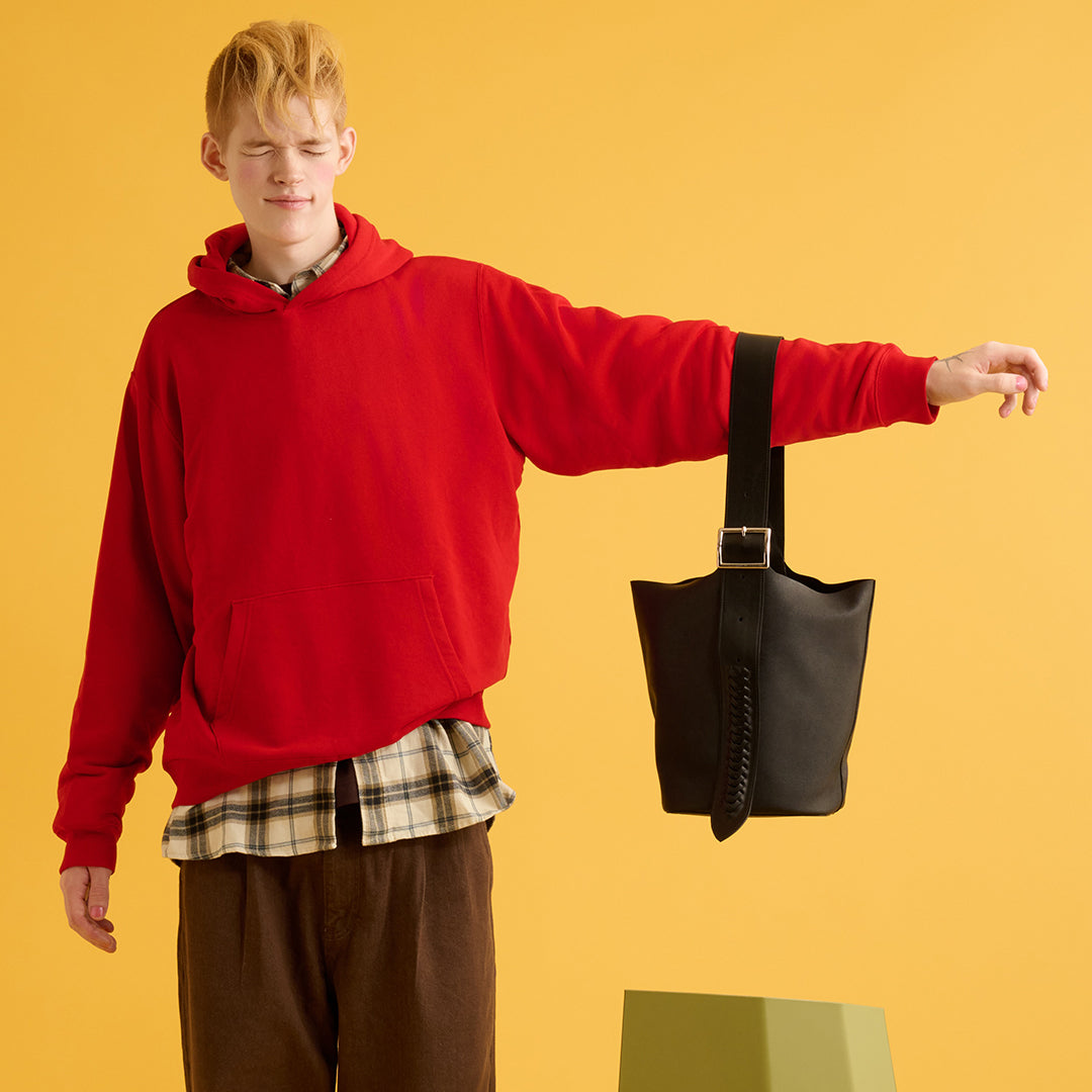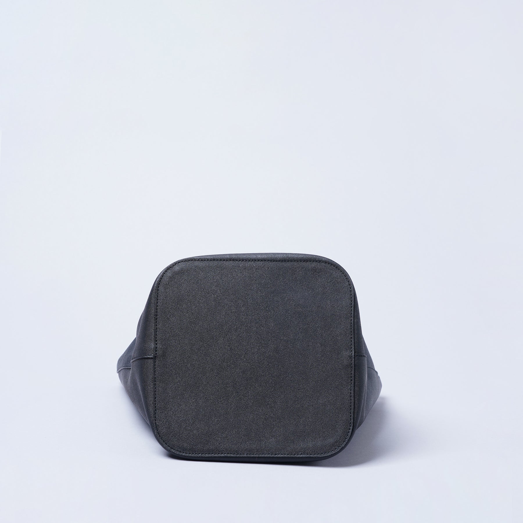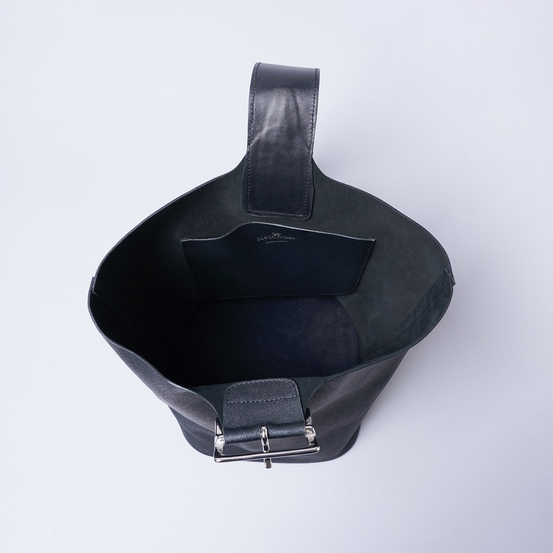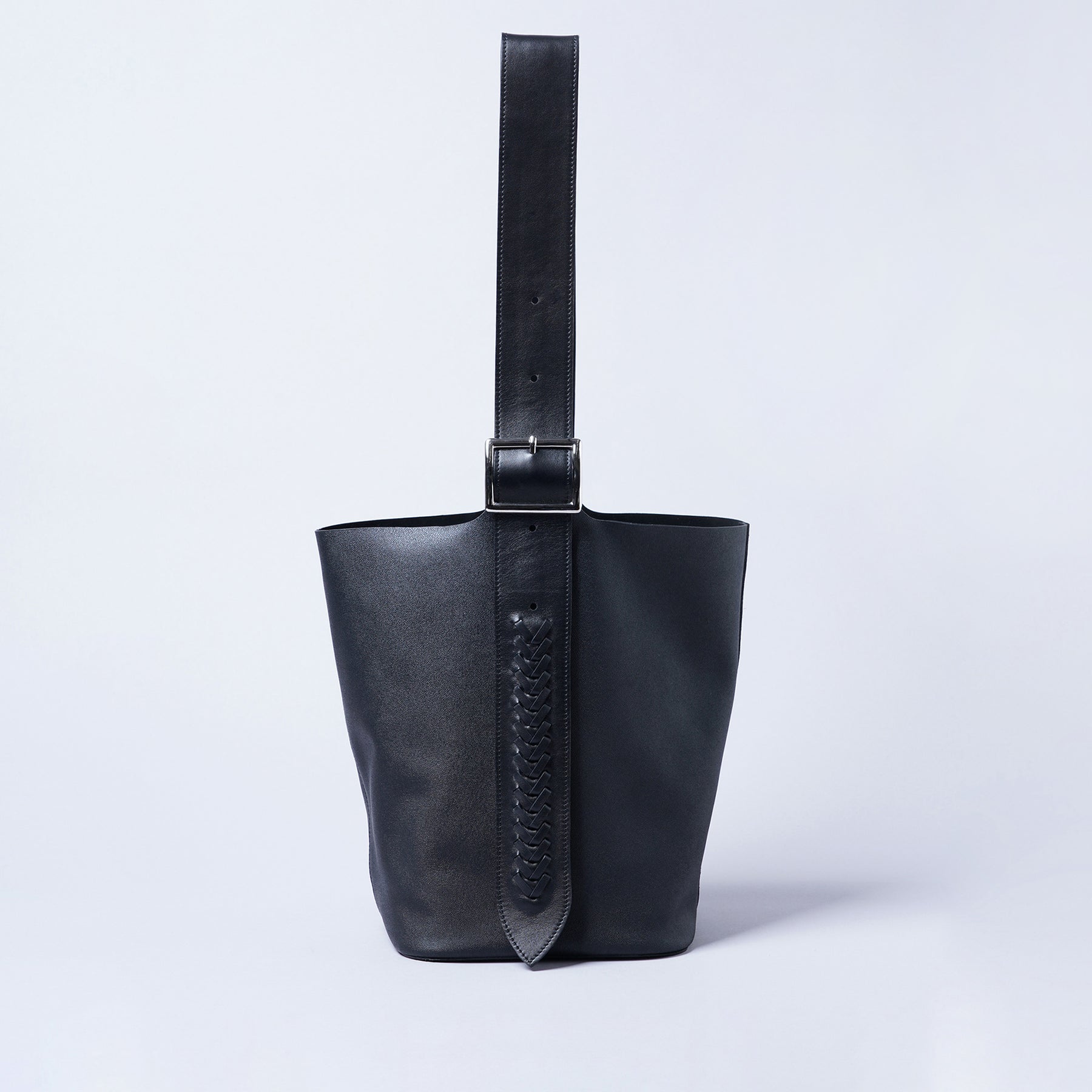 這款包包以穿搭主角為主軸概念進行設計。寬幅提把大膽加入手編裝飾,既凸顯視覺效果更良好的融入於符合日常實用的水桶型托特包中。提把材質採用柔軟的義大利小牛皮,包身則選用英國知名老字號鞣革廠CFS(Charles F. Stead)所生產的皮革製作。內裏與外側同樣以黑色調設計,不僅增添整體高級感,更不易使髒污明顯。貼心設計的貼袋亦為收納更添便利。