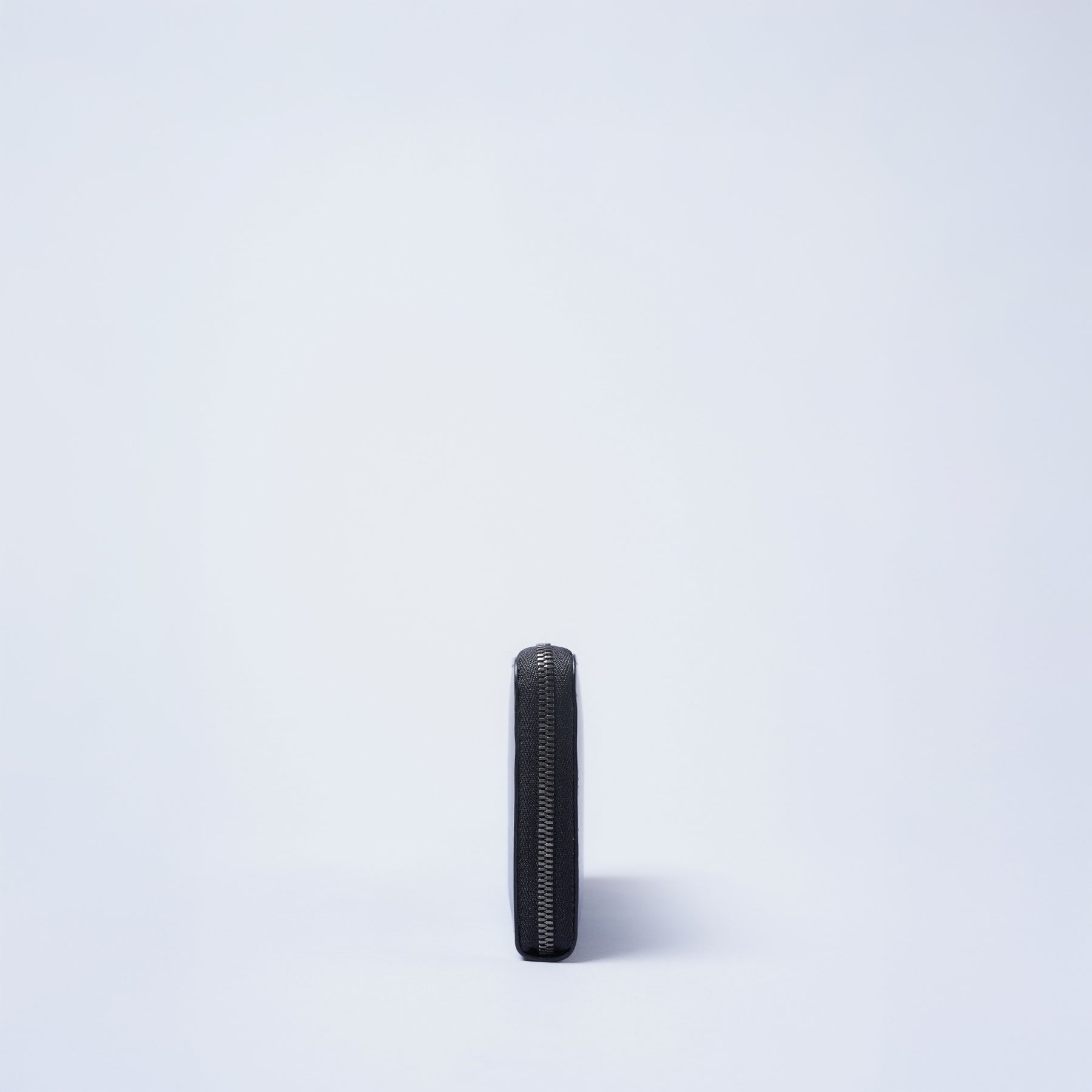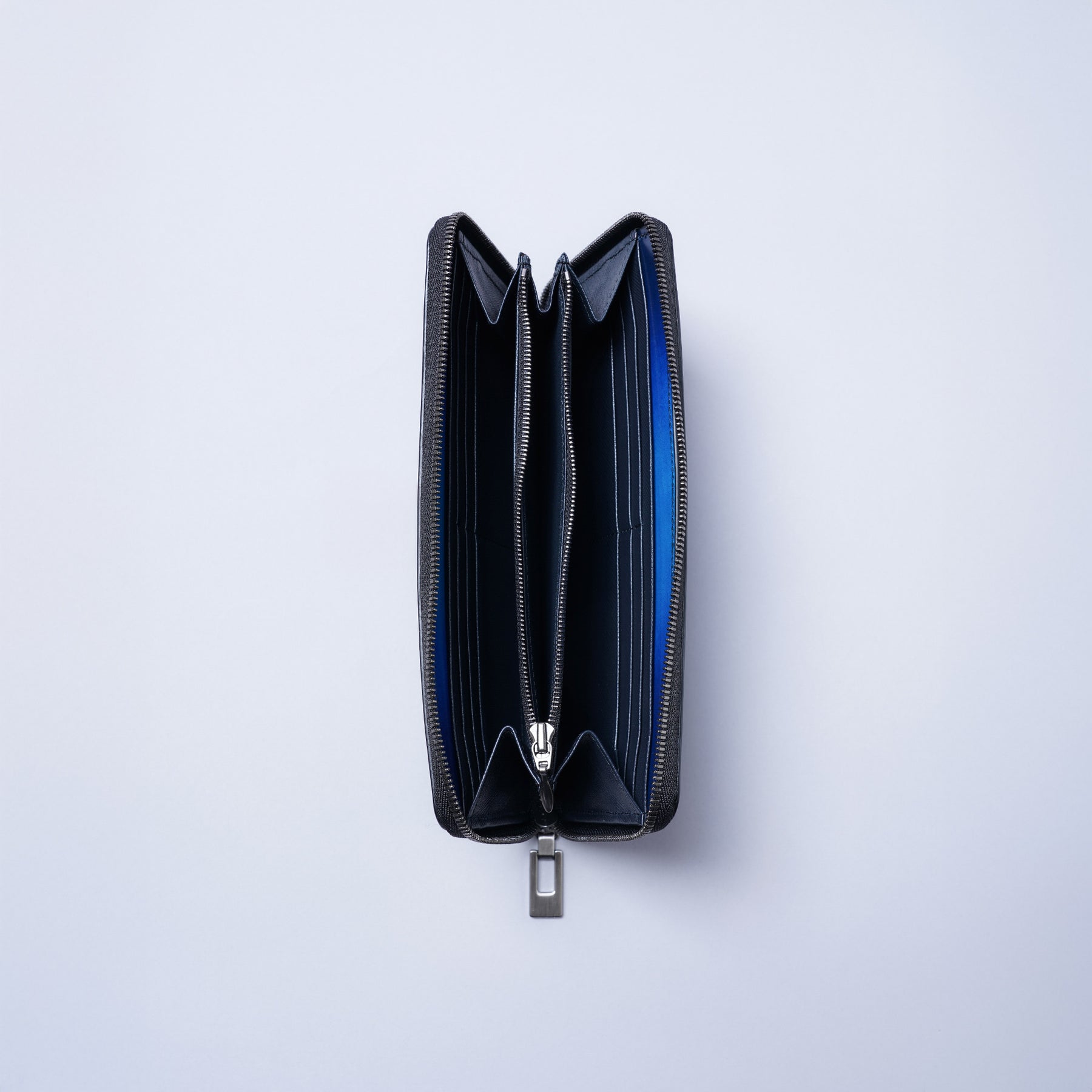 這款拉鍊長夾內裏特別選用刮痕不易顯現的十字壓紋牛皮(Saffiano Leather)製作,由於錢包內側經常碰觸零錢及卡片,此款皮革能有效隱藏刮痕。內裏全面採用牛皮材質,並針對局部分別精細設定厚薄度與結構組成,以減輕重量。內部共可收納約50張紙鈔及12張卡片,在維持纖薄外型的同時,兼具充足的收納能力。此外,還設有兩處自由收納夾層,即使因票券或收據變多,也能讓錢包內部井然有序。