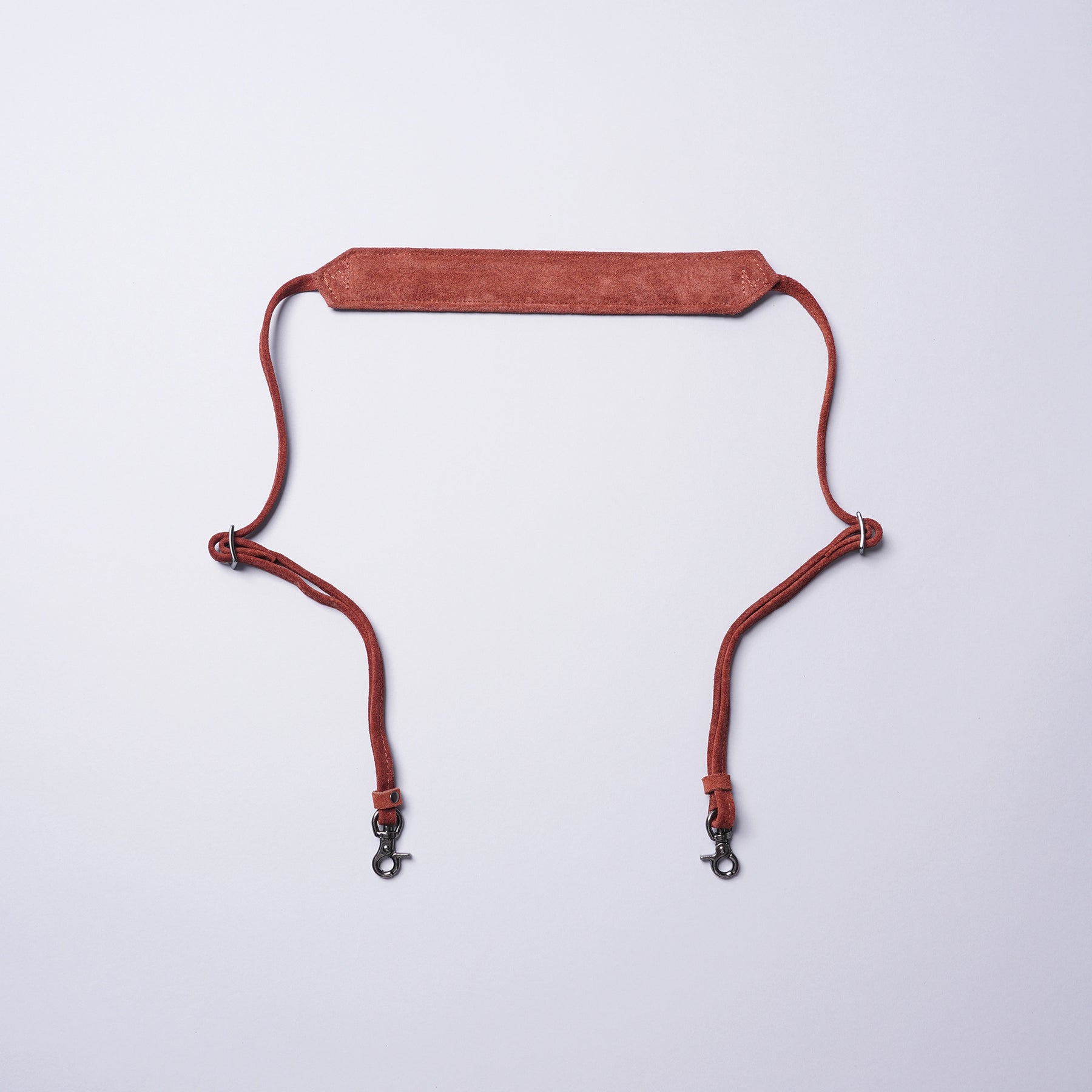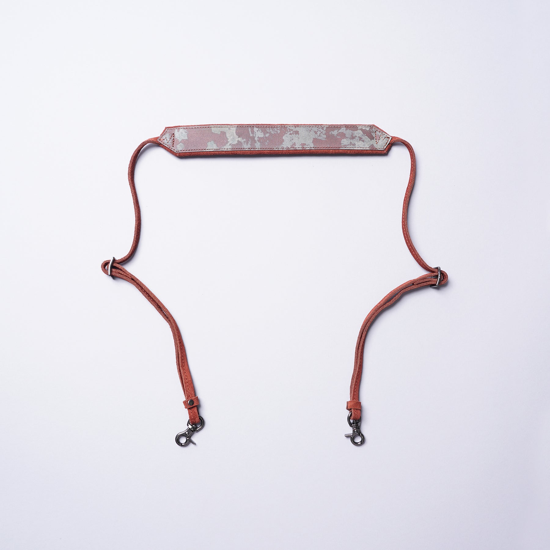 這款肩背帶是採用黃銅鏽加工處理之皮革製成,可用於裝置單眼相機等器材。此種材質乃由皮革職人依據積累經驗及感性將一片片皮革噴塗黃銅或紅銅,使之產生鏽化效果,既而精心製作成具有工藝品等級的皮革。這是一款很稀有的皮革配件,讓您可以隨身攜帶喜愛的相機。肩背帶長度為98cm~144cm,可任意調整為需求的長度,附屬的皮繩也為可拆卸式。鏽色皮革裏層採用天鵝絨皮革,觸感極佳,更可與各種顏色搭配。